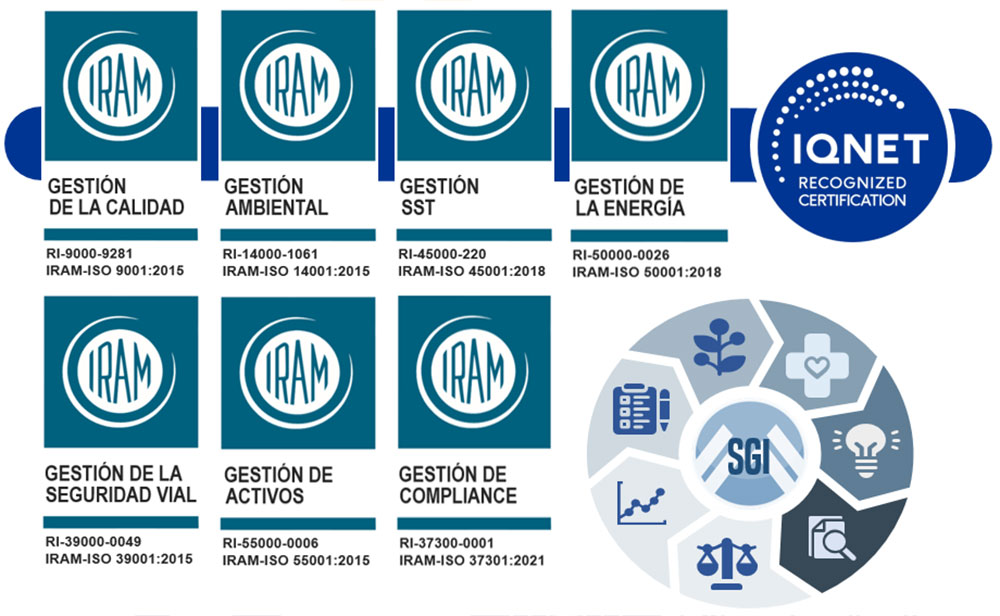 ISO 9001:2015 (SGC); ISO 14001 (SGA); ISO 39001 (SGSV); ISO 37301 (SGCo); ISO 45001 (SGSST); ISO 50001 (SGEn); ISO 55001 (SGAc).